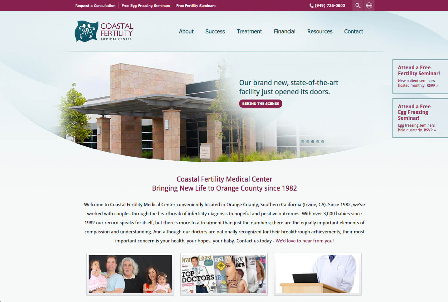 IV Interactive created and launched a new website design for Coastal Fertility Medical Center. The design was inspired by the ocean, with calming colors and subtle wave-like shapes worked into the site design. Focus was placed on the user experience, building an intuitive navigation for patients and medical professionals with easily accessible ‘calls to action’ strategically placed throughout the website. It was also built to be search-engine friendly, to enhance Coastal Fertility’s online web presence. A unique feature of the new design is the news-like format of the homepage which features a wealth information in a clean and simple format, and the photo galleries of their new fertility center and newborns.